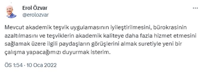 Yükseköğretim Kurulu Lideri Prof. Dr. Erol ÖZVAR tarafından 10 Ocak 2022 tarihli eski ismiyle Twitter yeni ismiyle X paylaşımında, şu tabirlere yer verilmişti.