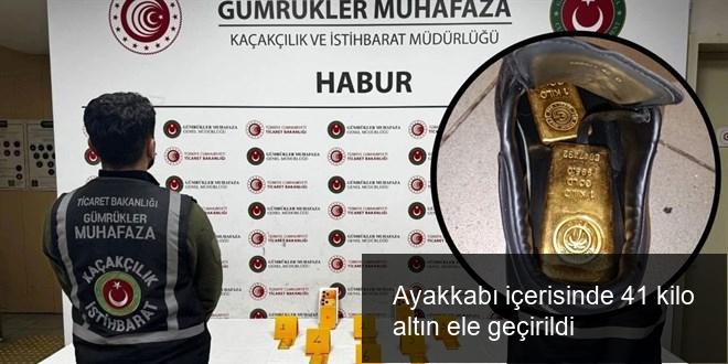 Şırnak’taki Habur Gümrük Kapısı’nda ayakkabıların içerisine gizlenmiş vaziyette 41 kilogram altın ele geçirildi.