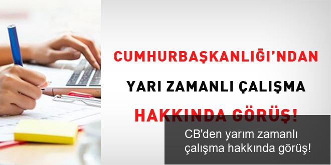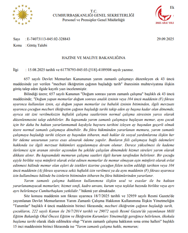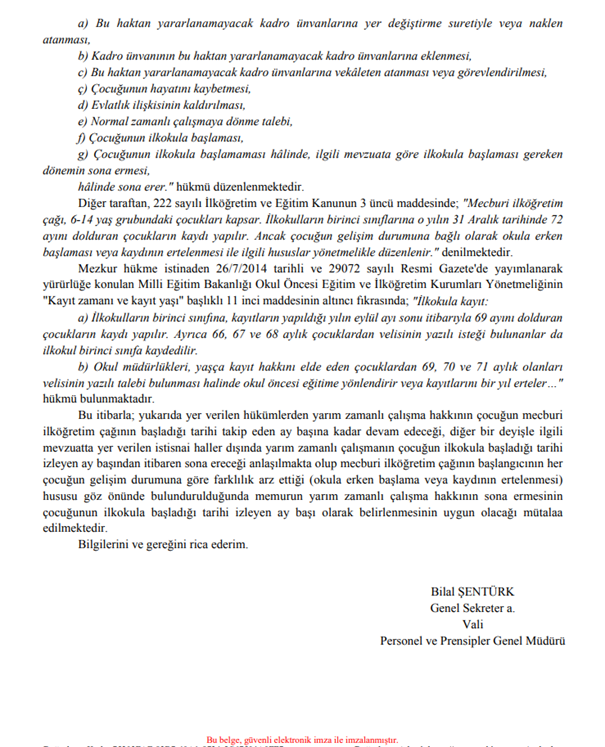 Cumhurbaşkanlığı tarafından verilen görüşte; yarım vakitli çalışma hakkının çocuğun mecburi ilköğretim çağının başladığı tarihi takip eden ay başına kadar devam edeceği, öteki bir deyişle ilgili mevzuatta yer verilen istisnai haller dışında yarım vakitli çalışmanın çocuğun ilkokula başladığı tarihi izleyen ay başından itibaren sona ereceği anlaşılması gerektiği, mecburi ilköğretim çağının başlangıcının her çocuğun gelişim durumuna nazaran farklılık arz ettiği (okula erken başlama yahut kaydının ertelenmesi) hususu dikkate alındığında memurun yarım vakitli çalışma hakkının sona ermesinin çocuğunun ilkokula başladığı tarihi izleyen ay başı olarak belirlenmesinin uygun olacağı söz edilmiştir.