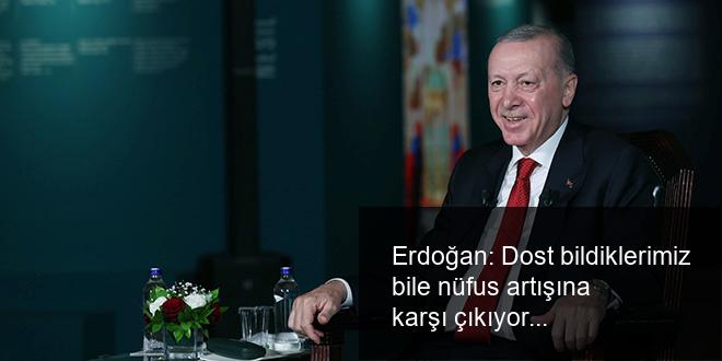 Cumhurbaşkanı Erdoğan, Yasemin Karaca’nın, “Sizi aile içi kimliklerinizden eş, bir evlat, bir dede olarak, bir baba olarak da biliyoruz. Siz bunlardan hangisi olmayı daha çok seviyorsunuz?” Sorusuna şu karşılığı verdi: “Her şeyden evvel doğal dedeyim ve 9 tane de elhamdülillah torunum var. O da yoksul için farklı bir hoşluk. Biliyorsunuz devamlı söylediğim bir kelam var, “En az 3 çocuk” diyorum. Bu doğal güçlü bir ailenin olmazsa olmazı. Kuşağımızı çoğaltmamız lazım. Bu kuşağın artması lazım. Bu doğal bizim isteğimiz değil, Rabbimizin buyruğu. Sevgili Habibinin bizlere daima olarak tavsiyesi. “Diğer toplumlara karşı ümmetimin çokluğuyla iftihar ederim” diyor Peygamberimiz. Öyleyse bunun yerine gelmesi lazım. Bunun için de biz aile derken buradan hareket ederek geçtiğimiz yılı ‘Aile Yılı’ olarak ilan ettik. Ve Aile Yılı olarak bu adımı atmamızın da esbab-ı mucibesi, bilhassa bir halkı Müslüman olan topluluk olarak bunu hiç tereddütsüz bu kuşağı ülkemizde çoğaltalım istiyoruz.”