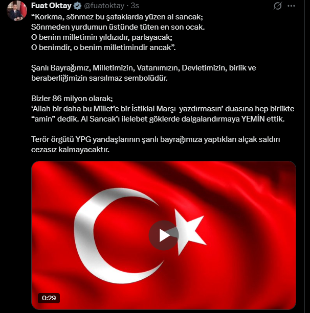 Fuat Oktay: Bayrağımıza yapılan bu alçak saldırı cezasız kalmayacaktır! Ocak 21, 2026 yazar admin Oktay’ın mevzuya ait X paylaşımı şöyle:
