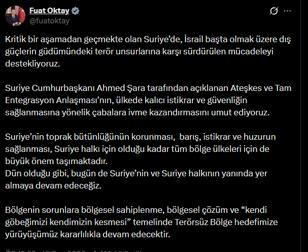 Suriye Cumhurbaşkanı Ahmed Şara tarafından açıklanan **”Ateşkes ve Tam Entegrasyon Anlaşması”**na da değinen Fuat Oktay, bu adımın ülkede kalıcı huzur ve itimat ortamını tesis etmesini temenni ettiklerini söyledi. Oktay, Suriye’de sağlanacak barışın sadece lokal halk için değil, tüm Orta Doğu coğrafyası için stratejik bir kazanım olacağını lisana getirdi.
