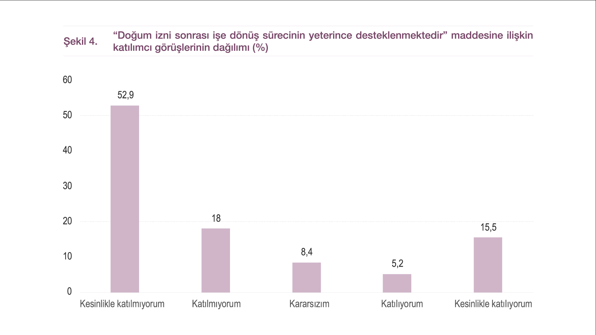 Araştırma sadece doğum müsaadesi mühletini değil, doğum sonrası işe dönüş sürecini de mercek altına aldı. İştirakçilerin %70,9’u, doğum müsaadesi sonrası işe dönüş sürecinin gereğince desteklenmediğini belirtti. Bu dayanak eksikliğinin, annelerde tükenmişlik hissini artırdığı, iş verimliliğini düşürdüğü ve mesleksel motivasyonu olumsuz etkilediği söz edildi.