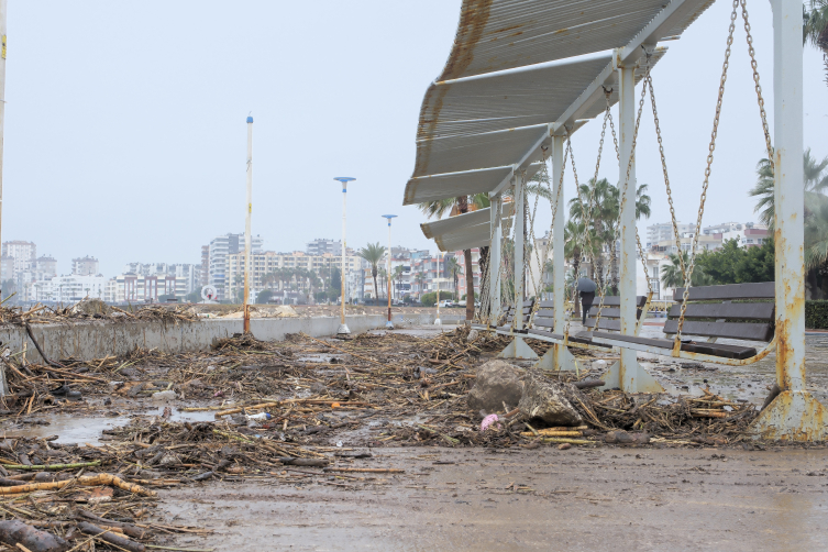 Mezitli Belediyesi grupları de yağışın tesiriyle sürüklenen çamur, kütük ve ağaç kesimlerinin biriktiği kıyı şeridini temizliyor.