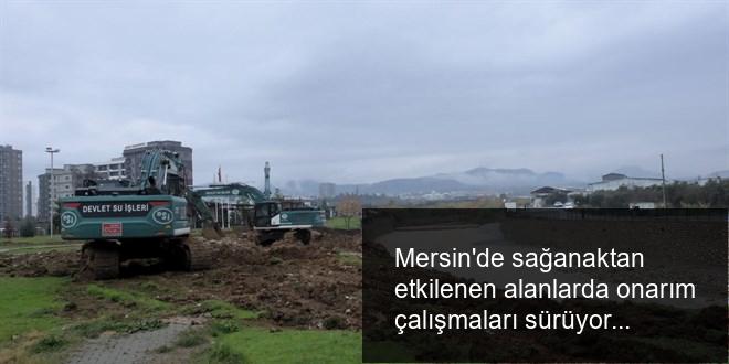 Devlet Su İşleri (DSİ) grupları, taşkın yaşanan Mezitli Deresi etrafında yıkılan duvarları onarıyor.