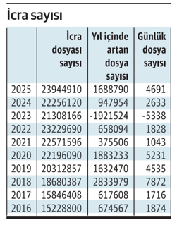 2025 yılı Kasım sonu prestijiyle karşılıksız çek meblağı 225 milyar liranın üzerine çıkarken, protestolu senet fiyatı 81 milyar lirayı aştı. İcra dairelerine ulaşan icra iflas evrakı sayısı ise 2025 yılı sonu prestijiyle 24 milyonun üzerine çıktı. Bir diğer tabir ile 86 milyonluk Türkiye’de her üç şahıstan biri icralık oldu. 2025 yılı prestijiyle günlük icra evrakı sayısı ortalama 4 bin 691 oldu.