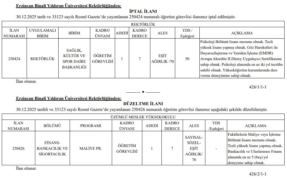 Erzincan Binali Yıldırım Üniversitesi tarafından her iki konuda yaptığı tekrar kıymetlendirme sonrası, Maliye mezunlarına müracaat bahtı verirken, öteki öğretim vazifelisi takımını ise iptal etmiştir.