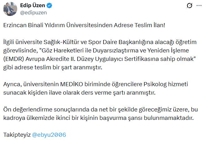 Ayrıca, X platformu üzerinden yeniden tarafımıza ulaşan bir şikayet üzerine yaptığımız paylaşımda, üniversiteye bağlı Sağlık-Kültür ve Spor Daire Başkanlığı bünyesinde ilan edilen öğretim vazifelisi takımının direkt makul bir adayı tanım ettiğini belirtmiştik.