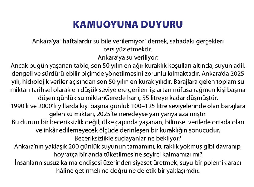 Bu nedenle su idaresinin istikrarlı yürütülmesinin zarurî hale geldiğini belirten Yavaş, kuraklığın kesintilerin art planındaki ana öge olduğunu vurguladı. Kelam konusu açıklamalar, belediyenin resmi toplumsal medya hesapları üzerinden de paylaşıldı.