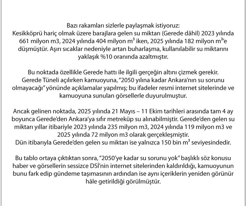 Örneğin, T24’ün resmi internet sitesinde yer alan ve Yavaş’ın “Bu durum kuraklıktan değil teknik arızadan kaynaklanmaktadır” dediği görüntü haberin artık erişime kapalı olduğu görülüyor. Bu durum, kamuoyunda “önceki açıklamalar mı sildiriliyor?” sorusunu da beraberinde getirdi.