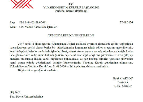 Bu konuyla ilgili olarak üniversiteler tarafından alınan ani kararları sona erdirmek ve araştırma vazifelilerinin planlama yapabilmesi ismine, yükseköğretim kurumlarının bu durumla ilgili kararını en az altı ay evvelce yazılı olarak bildirmesine ve kelam konusu bildirim yazısının resmi yazı ekinde YÖK’e sunulması gerekmektedir.