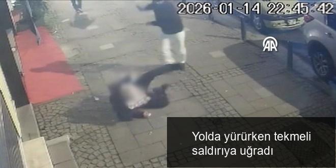 Çevredeki bir iş yerinin güvenlik kamerasına yansıyan imgelerde, yolda yürüyen bireye gerisinden koşarak gelen saldırganın tekme atarak yere düşürmesi, elindeki cisimle birkaç kere vurduktan sonra süratle uzaklaşması yer alıyor.